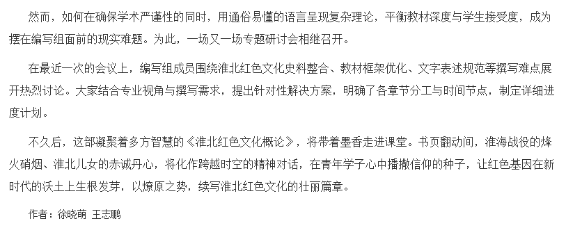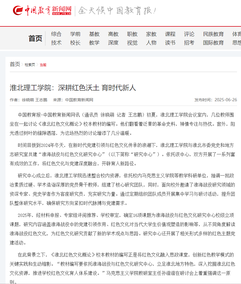 初夏,永利集团88304官网集团会议室内,几位教师围坐在一起讨论《淮北红色文化概论》校本教材的编写。他们翻看着泛黄的革命史料,神情专注与热忱。窗外,阳光透过树叶的缝隙洒落,为这场热烈的讨论增添了几分温暖。对此,中国教育报进行了报道: