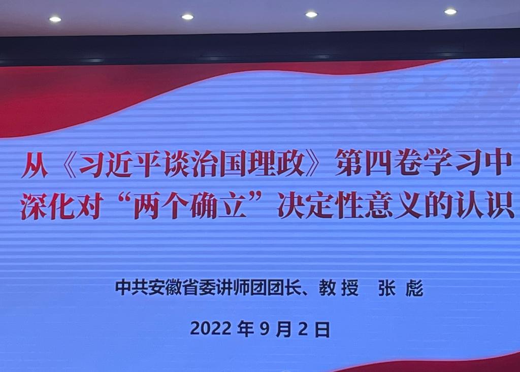 为贯彻落实习近平总书记在省部级主要领导干部专题研讨班上重要讲话精神,全省开展“举旗帜·送理论”省级示范宣讲活动。淮北市委宣传部邀请了中共安徽省委讲师团团长张彪教授于9月2日上午9时在市公安局报告厅作宣讲报告,张团长宣讲的主题为:从《习近平谈治国理政》第四卷学习中深化对“两个确立”决定性意义的认识。永利集团88304官网集团刘奔前和孙澄澄老师作为入选的淮北市宣讲团成员,代表学校参加会议。