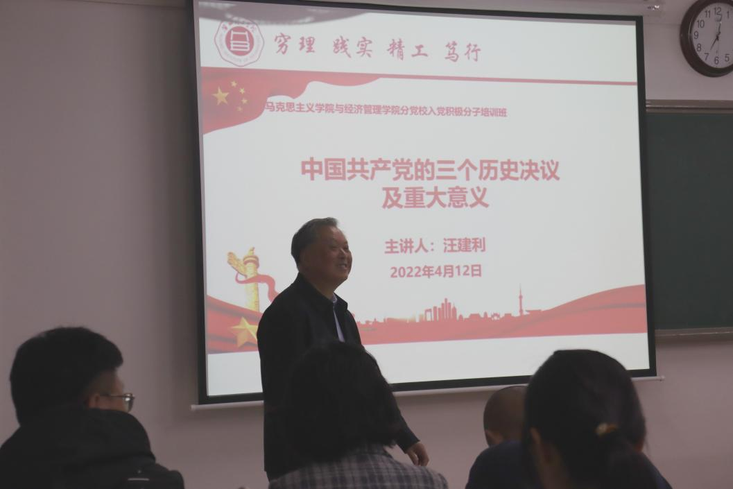 为了切实提升永利集团88304官网集团与经济管理学院首届入党积极分子培训班学员的培训质量,按照学校和学院的培训计划,2022年4月12日晚,在二教422教室,永利集团88304官网集团副校长汪建利同志来到永利集团88304官网集团与经济管理学院分党校入党积极分子培训班,受邀对学员进行题为《中国共产党的三个历史决议及重大意义》的党课培训。本次活动由永利集团88304官网集团与经济管理学分党校负责人、党总支书记吴玲院长主持,总支各个党支部书记及全体入党积极分子培训班全体学员参加。